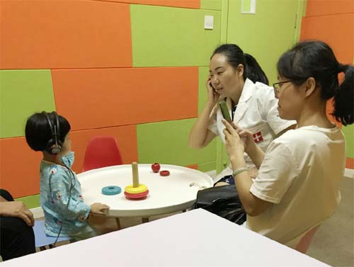 儿童言语识别率测试:通过儿童专用的言语测试词表,听力师针对不同孩子的不同听觉发展阶段,采用多种适合儿童的测试方法,分别进行安静/噪声环境下的词汇、语句的识别能力测试,评估孩子的言语识别能力并根据测试结果进行微调。